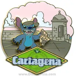 Cartagena - Stitch is a Limited Edition (LE) 1000 pin from the Disney Cruise Line Destinations: Eastbound Panama Canal Crossing 2008 pin series. It was originally released on , 2008 and was available from Disney Cruise Line .