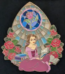 Belle with Book - Stained Glass is a Limited Edition (LE) 40 pin from the Fantasy Pin Series pin series. It is an Unlicensed (Fantasy) pin, so therefore it is not allowed to be traded in the Disney Parks.