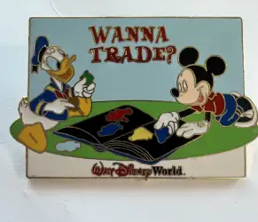 Mickey and Donald Trading is a Limited Edition (LE) 2500 pin from the Wanna Trade? pin series. It was originally released on , 2001 and was available from Walt Disney World .