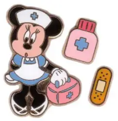 Nurse Minnie with medicine bottle and plaster set is an Open Edition 0-pin set. It was originally released on , 2002 and was available from Disney Store Japan .