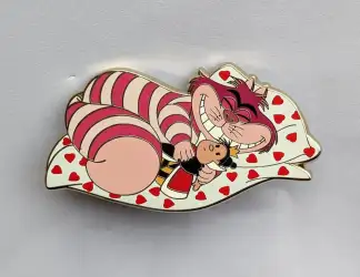Cheshire Cat cuddling Queen of Hearts doll (animated version) is a Limited Edition (LE) 100 pin from the Fantasy Pin Series: Nekopopshop - Sleeping Cats pin series. It is an Unlicensed (Fantasy) pin, so therefore it is not allowed to be traded in the Disney Parks.