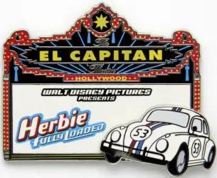 Herbie Fully Loaded is a Limited Edition (LE) 150 pin from the El Capitan Marquee Series pin series. It was originally released on , 2008 and was available from Disney Studio Store Hollywood / Soda Fountain .