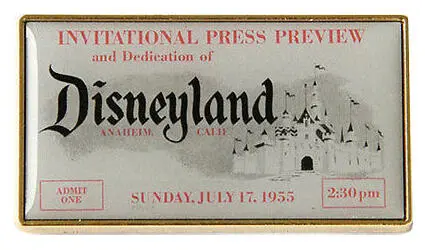 Invitational Press Preview Ticket is a Limited Edition (LE) 1955 pin in the Press Kit Starter Set 7-pin set from the Dateline: Disneyland 1955 pin series. It was originally released on , 2010 and was available from Disneyland Resort .