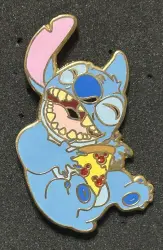 Stitch eating Pizza is a pin from the Bootleg pin series. It is an Unlicensed (Fantasy) pin, so therefore it is not allowed to be traded in the Disney Parks.