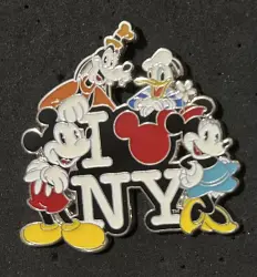 Mickey Goofy Donald Minnie I heart NY is an Open Edition pin from the World Of Disney (NYC) pin series. It was available from Disney Store US .