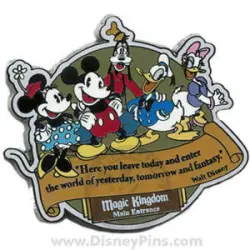 Magic Kingdom Main Entrance is a Limited Edition (LE) 2500 pin from the Cast 2008 Legacy Fair pin series. It was originally released on , 2008 and was available from Theme Park Cast Member Exclusive .