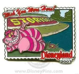 Cheshire on Storybook Land Canal is a Limited Edition (LE) 1000 pin from the Wish You Were Here! - Postcards from Disneyland pin series. It was originally released on , 2007 and was available from Disneyland Resort .