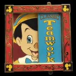 Pinocchio and Jiminy Cricket is a Limited Edition (LE) 1000 pin from the Classic Teamwork Slider Series pin series. It was originally released on , 2017 and was available from Theme Park Cast Member Exclusive .