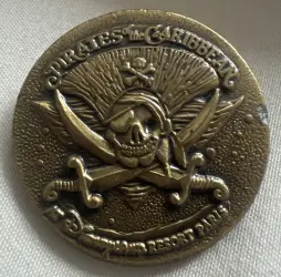Skull and Crossed Swords Logo Coin is an Open Edition pin from the Pirates of the Caribbean pin series. It was originally released on , 2007 and was available from Disneyland Resort Paris .