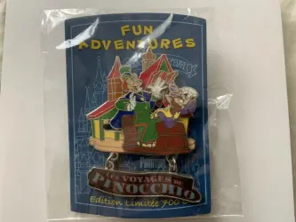 Les voyages de Pinocchio - Honest John and Gideon is a Limited Edition (LE) 700 pin from the Fun Adventures Series pin series. It was originally released on , 2018 and was available from Disneyland Resort Paris .