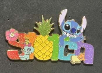 Stitch Rainbow Name - glitter Variant is a pin. It is an Unlicensed (Fantasy) pin, so therefore it is not allowed to be traded in the Disney Parks.