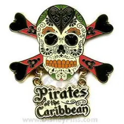 Sugar Skull Crossbone Pirates Logo is an Open Edition pin from the Pirates of the Caribbean pin series. It was originally released on , 2007 and was available from Multiple Sources (WDW, DLR, etc.).