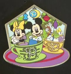 Tea Cups 50th, Mickey, Minnie, Donald, Daisy is a pin. It is an Unlicensed (Fantasy) pin, so therefore it is not allowed to be traded in the Disney Parks.