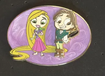 Cute Rapunzel and Flynn Tangled is a Limited Edition (LE) 50 pin. It is an Unlicensed (Fantasy) pin, so therefore it is not allowed to be traded in the Disney Parks.