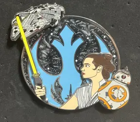 Rey and BB-8 with Millennium Falcon is a Limited Edition (LE) pin. It is an Unlicensed (Fantasy) pin, so therefore it is not allowed to be traded in the Disney Parks.