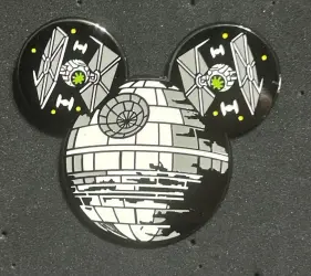 Mickey Icon: Death Star and Tie Fighters is a Limited Edition (LE) 150 pin. It is an Unlicensed (Fantasy) pin, so therefore it is not allowed to be traded in the Disney Parks.