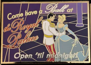 Cinderella and Prince Charming at the Royal Palace is a Limited Edition (LE) 100 pin from the Disney Auctions Postcard Series pin series. It was originally released on , 2004 and was available from Disney Auctions .