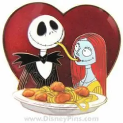 Jack & Sally is a Limited Edition (LE) 300 pin from the Sharing Spaghetti pin series. It was originally released on , 2009 and was available from Disney Studio Store Hollywood / Soda Fountain .