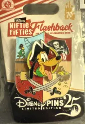 Pluto (Adventureland) is a Limited Edition (LE) 500 pin from the Niftie Fifties Flashback Pin Trading Celebration 2025: Disneyland Banners pin series. It was originally released on , 2025 and was available from Disneyland Resort .