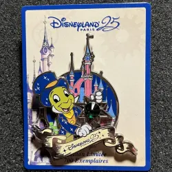 Jiminy Cricket is a Limited Edition (LE) 700 pin from the Disneyland Paris 25th Anniversary: Castles Series pin series. It was originally released on , 2018 and was available from Disneyland Resort Paris .