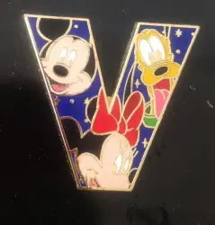 V Mickey, Minnie and Pluto is an Open Edition pin from the Alphabet Stars Letters pin series. It was originally released on , 2011 and was available from Multiple Sources (WDW, DLR, etc.).
