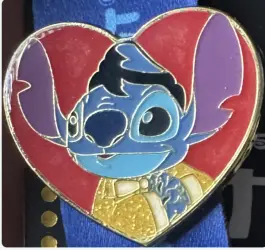 Stitch as Gold Lamé Suit Elvis in Heart is an Open Edition pin in the Disney Stitch - Elvis Deluxe Pins & Lanyard Set 4-pin set from the KidRobot Elvis Stitch Deluxe Pin & Lanyard Set pin series. It was originally released on , 2024 and was available from an Officially Licensed Disney trading pin vendor (see description for more information).