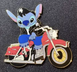 Stitch as Elvis with Motorcycle is a Limited Edition (LE) 100 pin from the Stitch as Elvis pin series. It was originally released on , 2006 and was available from Disney Auctions .