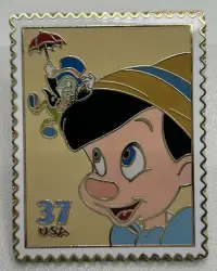 Pinocchio & Jiminy Cricket is an Open Edition pin from the USPS Stamp Release pin series. It was originally released on , 2005 and was available from Disneyland Resort .