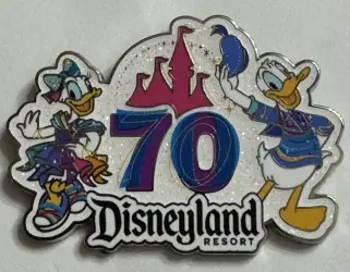 Donald and Daisy is an Open Edition pin from the WDTC/Costco/AAA Series: Disneyland Resort 70th Celebration, 2025 pin series. It was originally released on , 2025 and was available from an Officially Licensed Disney trading pin vendor (see description for more information).